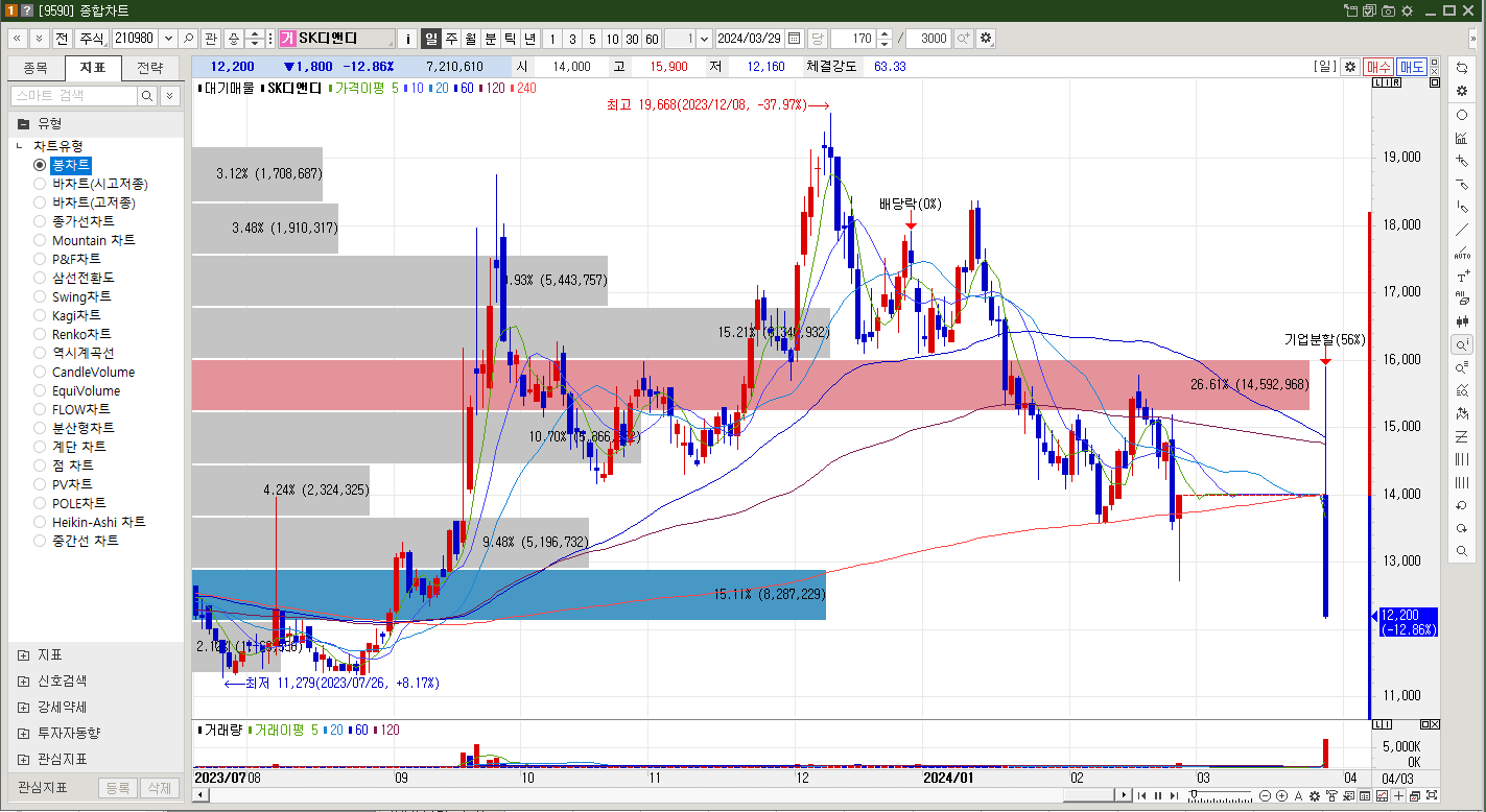그러다가 3월 29일 회사 분할 완료 후 거래재개된 SK디앤디 주가는 거래정지 전 대비 -12.86% 하락한 12,200원에 장을 마감했습니다.