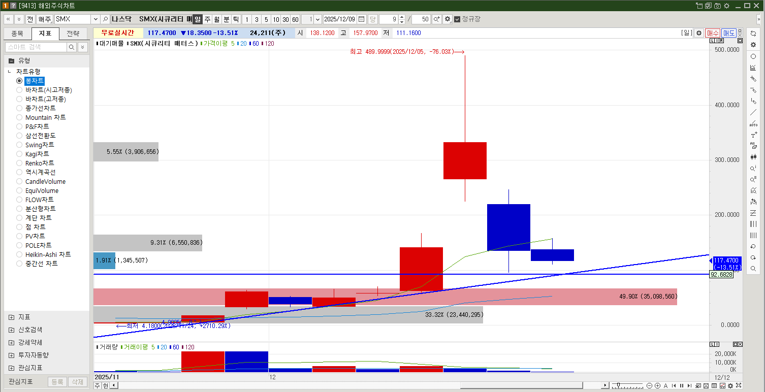 일봉 차트를 보면 시큐리티 매터스 주가는 현재 5일 이동평균선을 이탈한 상태입니다. 단기 추세선이 중요한 지지선 역할을 하고 있는데, 만약 이 추세선마저 종가 기준으로 이탈한다면 60달러대까지 하락할 가능성이 있습니다.