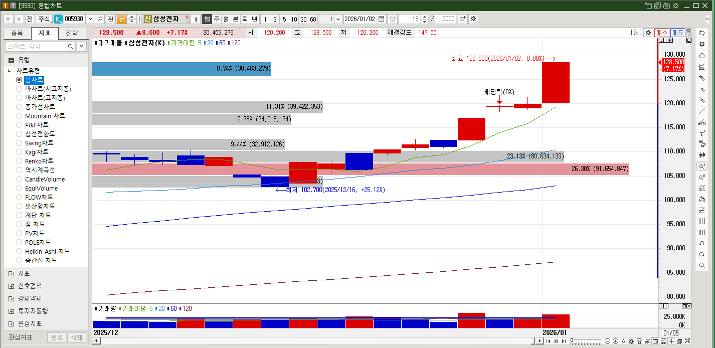 일봉 차트를 분석해보면, 현재 삼성전자 주가는 상승 추세선을 따라 우상향하는 패턴을 유지하고 있습니다. 다만 연말 산타 랠리로 인한 급등으로 추세선과의 괴리가 다소 발생한 상태입니다.
