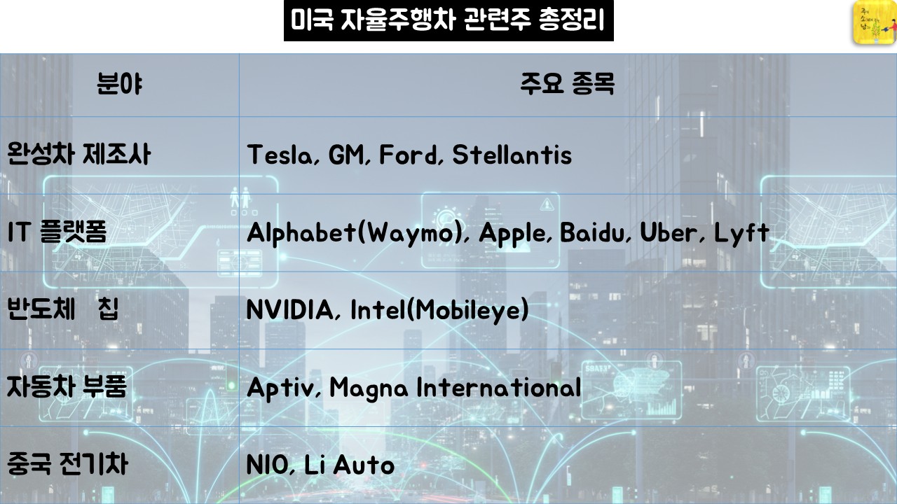 미국 자율주행차 관련주 분야별 정리표