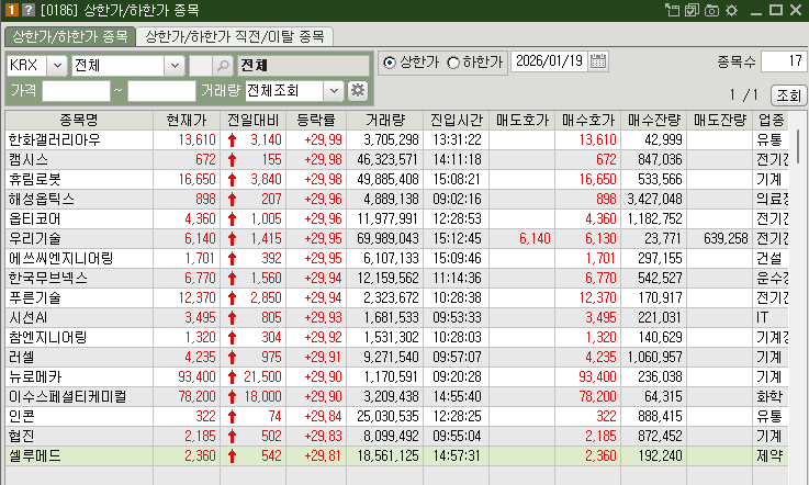 2026년 1월 19일 장 마감 기준으로 총 17개 종목이 상한가를 기록하며 투자자들의 이목을 집중시켰습니다. 오늘의 1월 19일 상한가 행진은 크게 세 가지 테마를 중심으로 전개되었는데, 보스턴다이내믹스의 휴머노이드 로봇 아틀라스 외신 호평, 한화그룹 인적분할 발표, 그리고 AI 데이터센터 전력 수요 이슈가 주요 동력이었습니다.