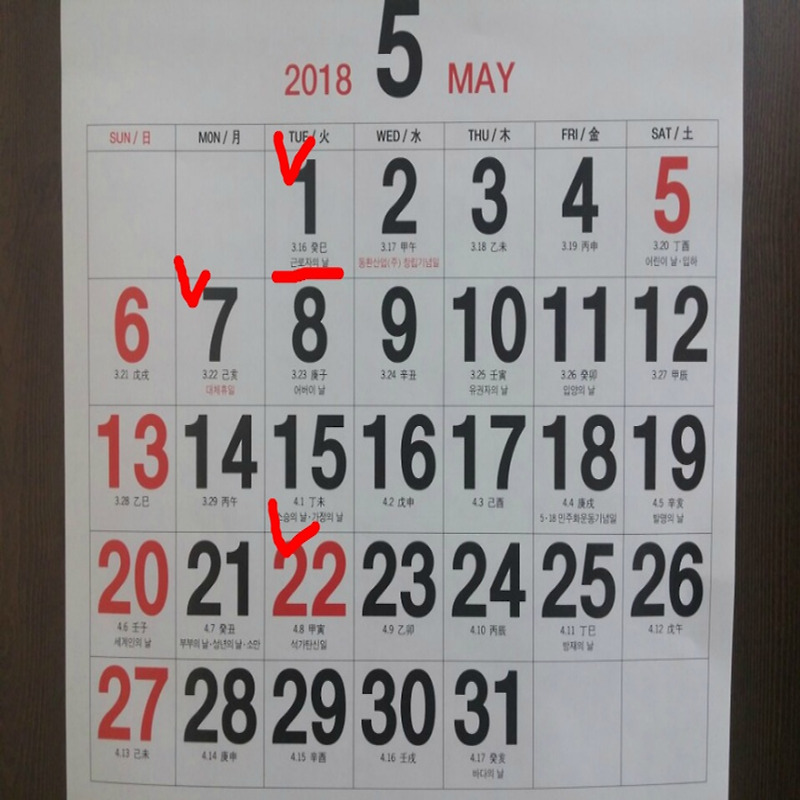 5월 달력을 미리 보았더니 평일 중에 빨간색으로 칠해진 날이 하루 밖에 보이지 않습니다. 5월은 가정의 달이라 여기저기 돈 나갈데도 많고, 휴일도 많았는데, 왜 달력에는 빨간날이 없나 싶었는데, 달력마다 차이가 있더군요. 5월 1일